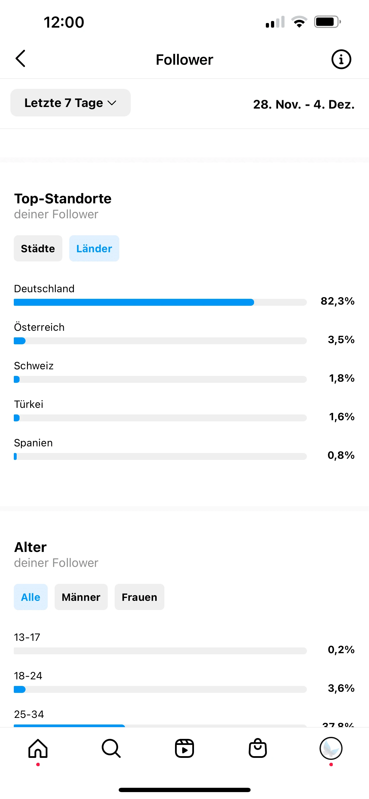 Du willst sehen, woher deine Follower kommen? Dann öffne Insights. Klicke auf „Gesamtzahl der Follower“ und scrolle dann etwas nach unten. Dort findest du die „Top-Länder“. Wähle den Reiter „Länder“ aus: