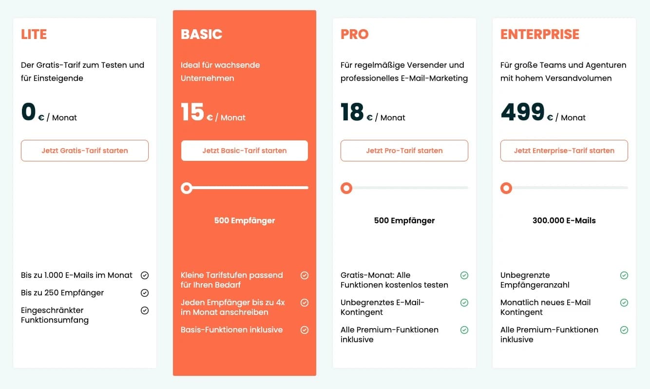 Der deutsche Anbieter CleverReach hingegen, den ich dir im Laufe dieses Artikels noch genauer vorstellen werde, stellt alle Funktionen in allen Tarifen zur Verfügung (abgesehen vom kostenlosen Tarif, der nur die Basis-Funktionen enthält):