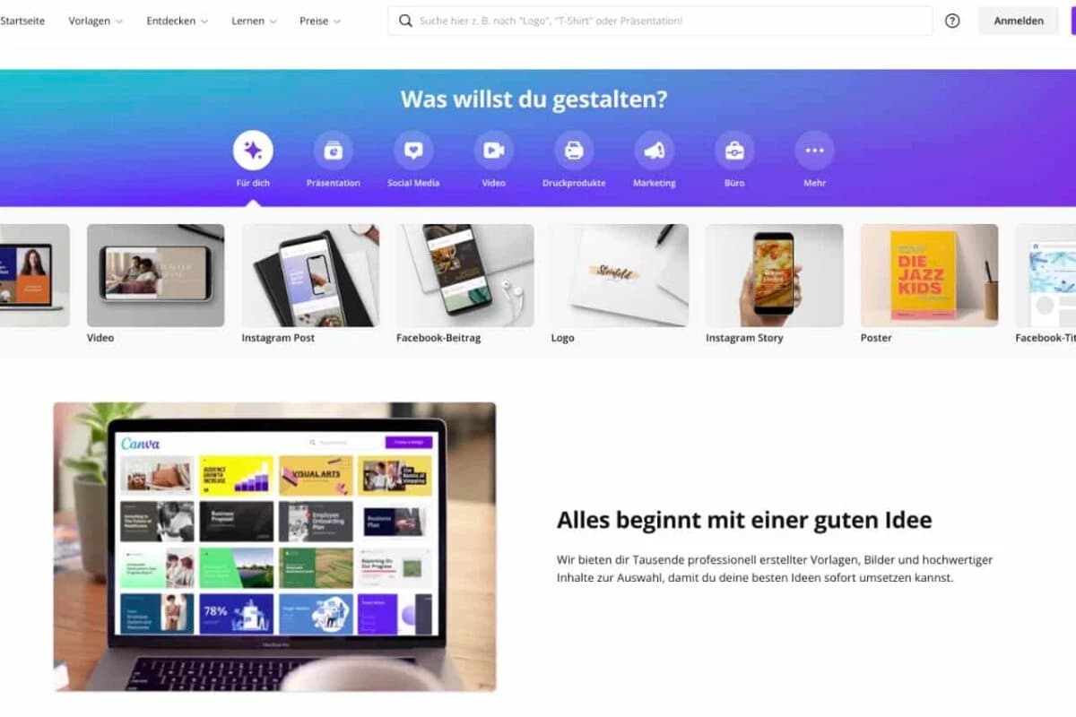 Das Programm hält hunderttausende vorgefertigter Templates für dich bereit: Von Instagram-Post bis hin zu YouTube-Banner oder Bildschirmpräsentation findest du für jeden Bereich die passende Vorlage.