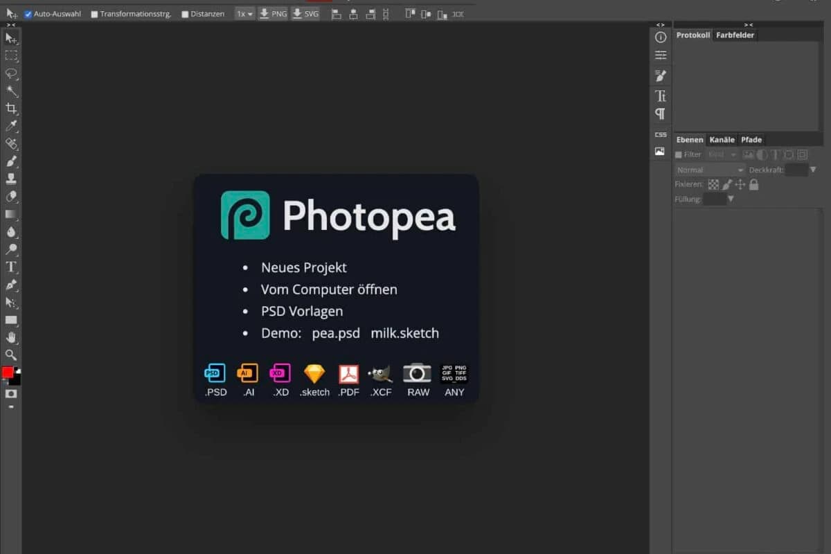 Photopea ist eine weitere browserbasierte Anwendung, die in unserer Liste definitiv nicht fehlen darf. Das Programm stellt dir zahlreiche Werkzeuge zur Verfügung, die du auch aus Photoshop kennst und kommst sogar mit Dateiformaten wie PSD, RAW, PDF oder CDR klar.