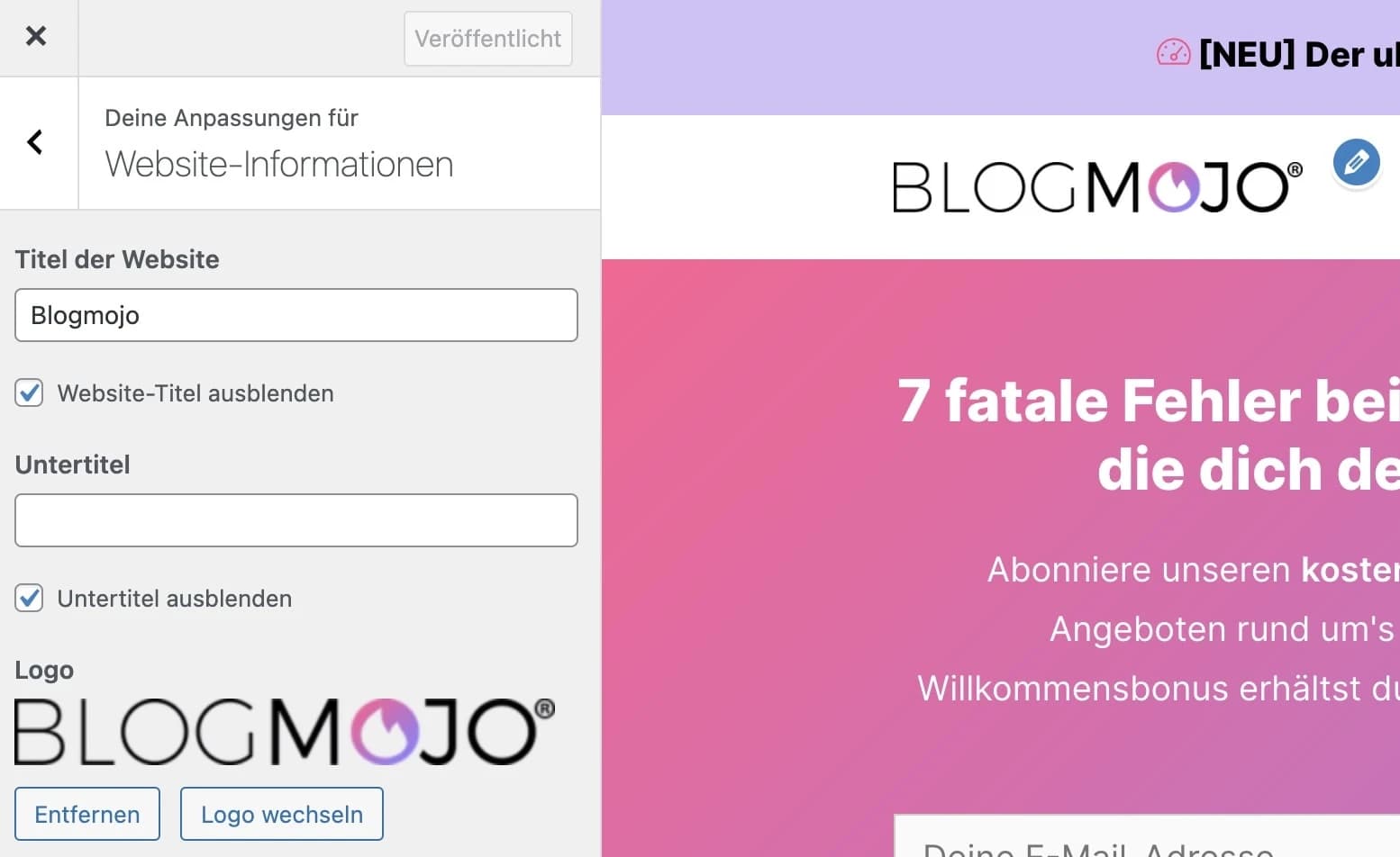 Einfügen kannst du dein Logo einfach und schnell über Design > Customizer > Website-Informationen: